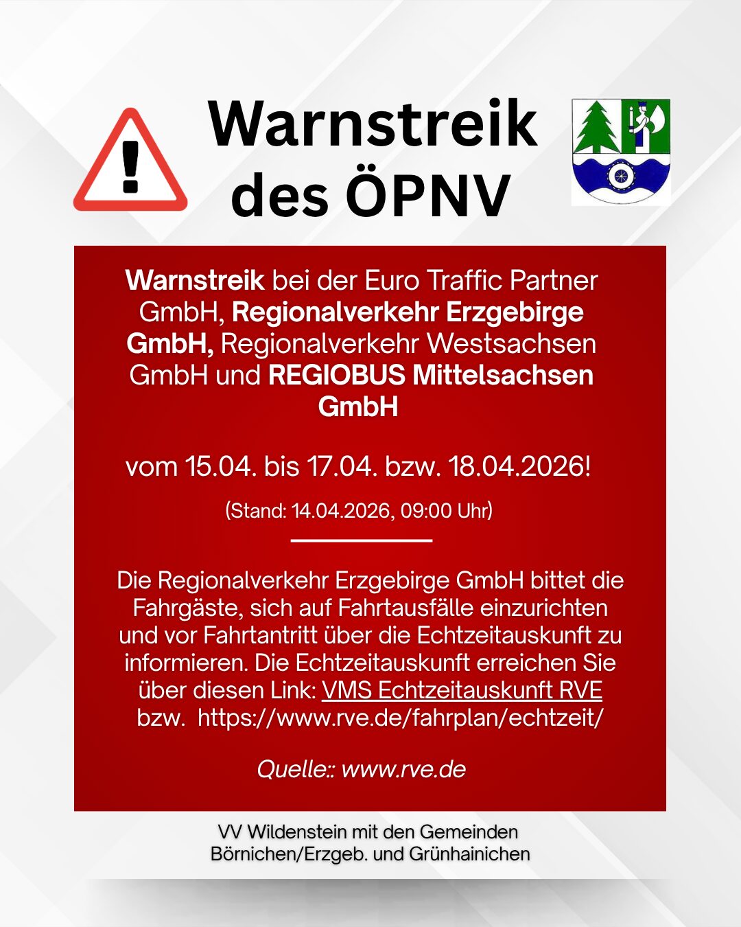 Bitte beachten Sie, dass der öffentliche Teil dieser Gemeinderatssitzung am 20.04.2026 bereits um 18 Uhr mit einer Ortsbegehung beginnt. Treffpunkt ist das Rathaus Börnichen, gegen 19:30 Uhr wird voraussichtlich die…